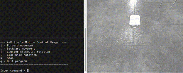 The qrb-ros-simulation package provides a simulation environment. It allows you to control the movement of QRB AMRs through publishing the ROS messages to the /qrb_robot_base/cmd_vel topic.