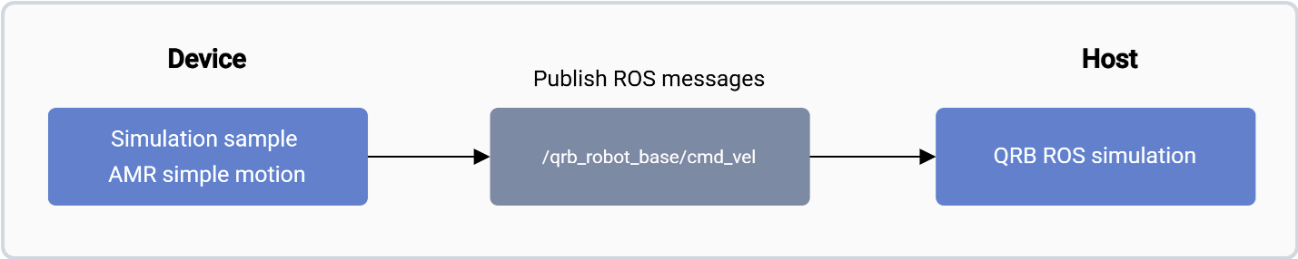 The AMR simple motion is a simulated sample application that uses a Python-based ROS node to control the movements of QRB autonomous moving robots (AMRs) within the simulator.