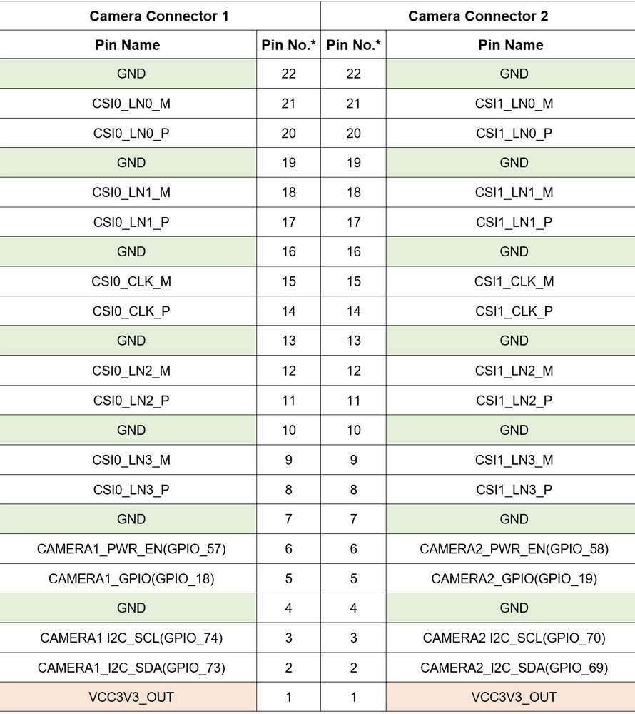 The following table lists the pin definition of the camera connector:
