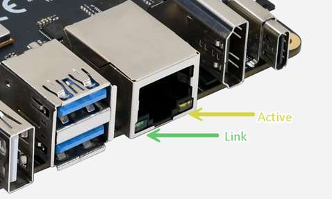 RUBIK Pi 3 is equipped with a standard RJ45 connector featuring Link and Active indicator LEDs. This connector supports high-speed communication at up to 1000 Mbps in full duplex mode, with backward compatibility for 100/10 Mbps via auto-negotiation.