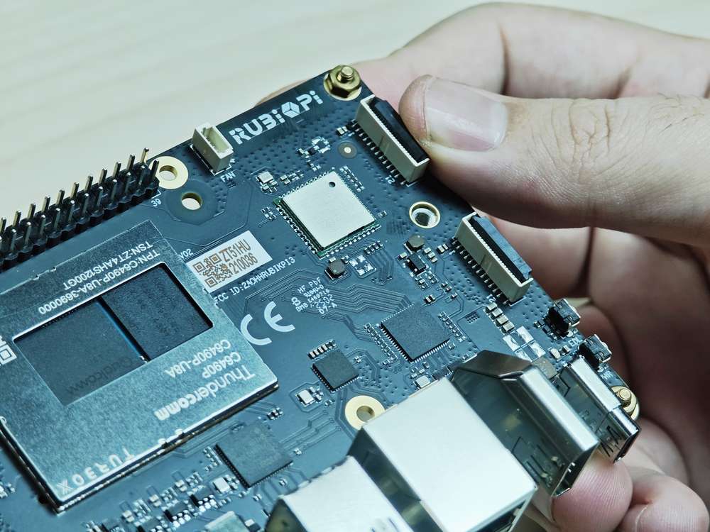 2. Insert the FPC. Ensure that the contacts are toward the center of RUBIK Pi 3.