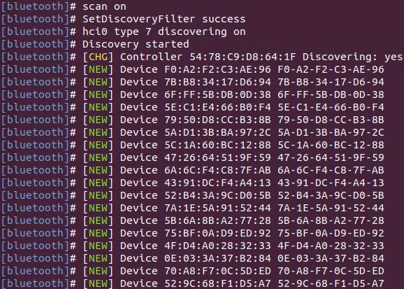 [bluetooth]# [CHG] Device 47:6E:17:4C:2A:3C RSSI: 0xffffffb8 (-72)