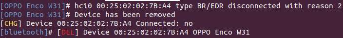 [OPPO Enco W31]# hci0 00:25:02:02:7B:A4 type BR/EDR disconnected with reason 2