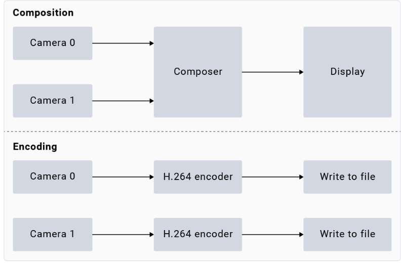 gst-multi-camera-example -o 1The device will store the encoded files in