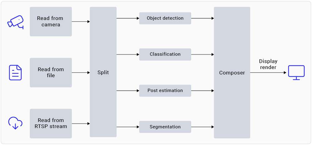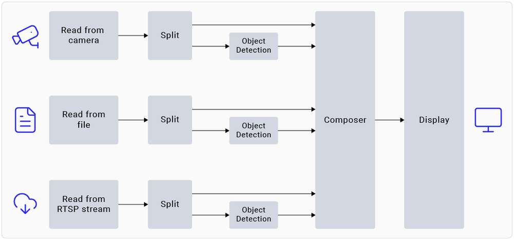 The gst-ai-object-detection sample application demonstrates the hardware capability to detect objects on camera, video file, or RTSP input streams. The pipeline receives the input stream, preprocesses it, runs inferences on AI hardware, and displays the results on the screen.